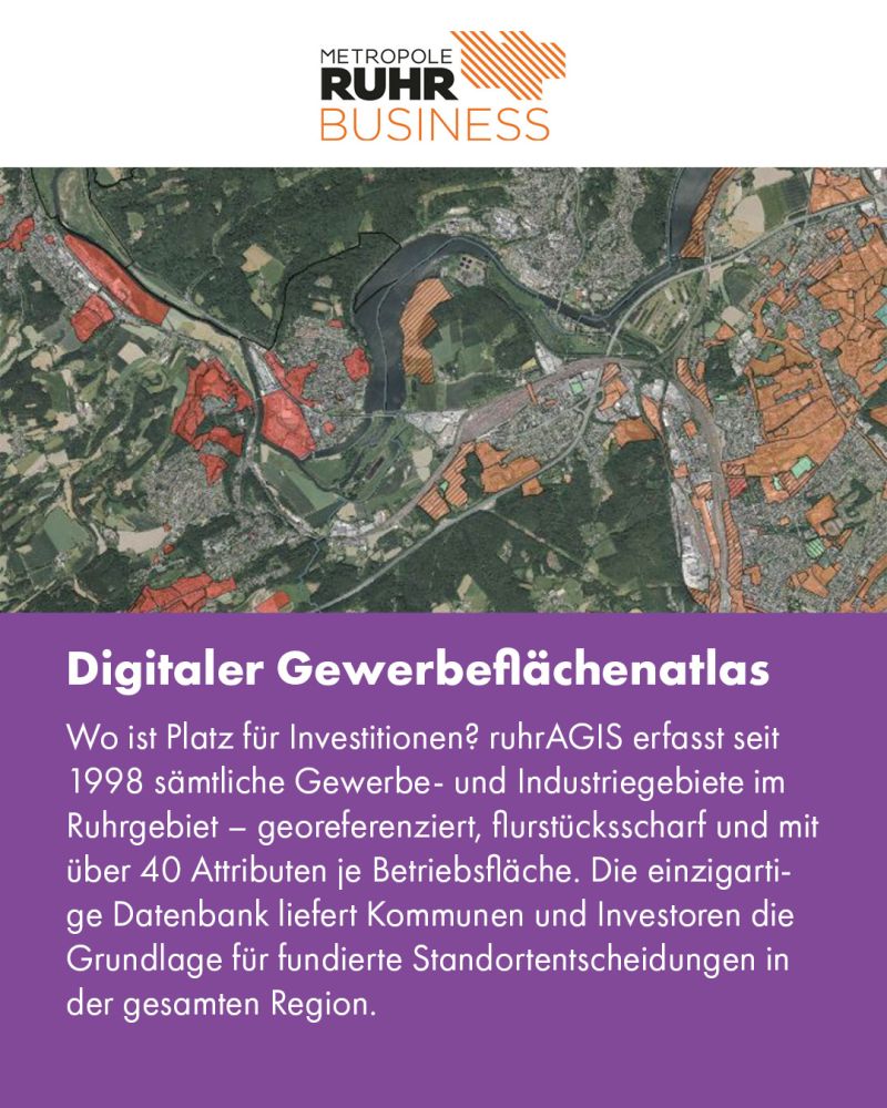 Die Lösung: Der Digitale Gewerbeflächenatlas ruhrAGIS bündelt diese Daten in einem digitalen Rauminformationssystem und macht Standorte, Flächenpotenziale und wirtschaftliche Strukturen im Ruhrgebiet übersichtlich sichtbar.